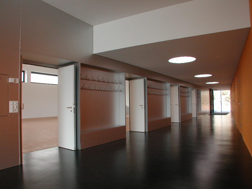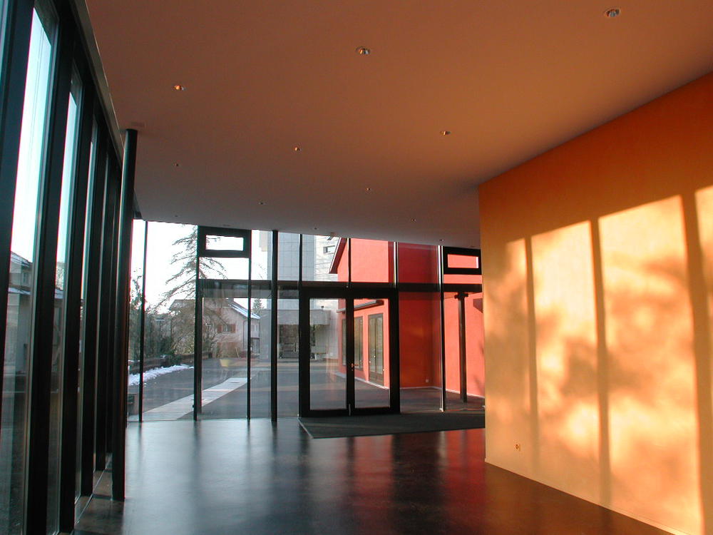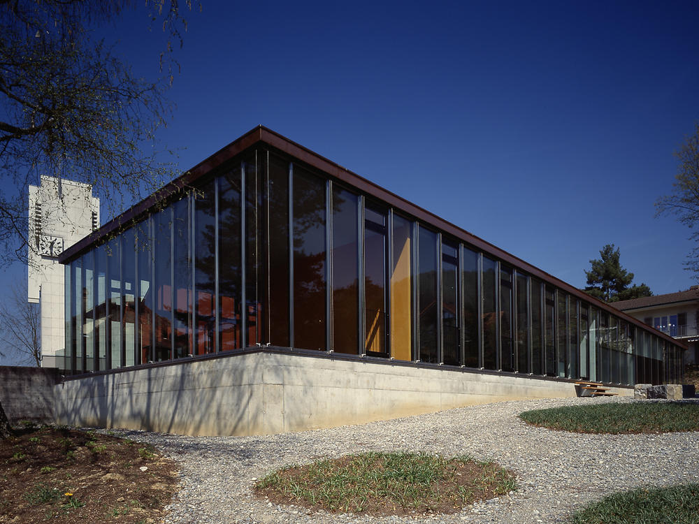 Das neue Begegnungszentrum steht der dominanten introvertierten Kirche von 1967 als offener Gebäudekomplex gegenüber. Es besteht aus der Alten Kirche von 1949 und einem eingeschossigen Erweiterungsbau. Der auf einer Terrasse gelegene Kirchenplatz bildet den eigentlichen Mittelpunkt der gesamten Anlage. Durch die Position des neuen Anbaus seitlich entlang der Alten Kirche wird er neu definiert und erweitert. Die Kirche und das neue Begegnungszentrum flankieren den Platz mit ihren Fassaden, mit ihren Volumen stehen sie jedoch im leicht abfallenden Gelände im Grünen. Der Künstler Paul Wyss aus Kappel entwickelte die farbige Gestaltung der Fassade wie auch der Foyerwände. So werden die beiden in ihrem Ausdruck gegensätzlichen Gebäudeteile mit dem Mittel der Farbe zu einem spannungsvollen Ganzen zusammengefügt. Das Leuchten der Farben spricht den Besucher an, lädt ein näherzutreten und zu verweilen. In ihrer äusseren Erscheinung bleibt die Alte Kirche klar ablesbar. Das leuchtende Dunkelrot der Fassade verleiht ihr neue Präsenz und nimmt sie gleichzeitig optisch zurück, um so dem dominanten Kirchenbau mehr Raum zu geben. Das neue grosszügige Foyer heisst die Besucher mit einem leuchtenden Gelb und durch das schräg angehobene Dach willkommen. Umgeben von mächtigen Kiefern und Birken ist es gleichzeitig Eingang, Empfangs- und Begegnungsraum. Pfarreistube, Sitzungszimmer und Küche sind ebenfalls mit diesem leuchtend gelben Wandbild umhüllt und orientieren sich zur grünen Umgebung. Der Saal, ein ursprünglich introvertierter Kirchenraum, wird durch die neuen grosszügigen Oberlichter zu einem hellen luftigen Raum mit heiterer Atmosphäre. Direkten Bezug zum Kirchenplatz schaffen die neuen grossen Fensteröffnungen auf Platzniveau. Veranstaltungen können somit übergreifend sowohl drinnen als auch draussen stattfinden. Der Saal bietet Platz für 120 Personen und verfügt über eine kleine Bühne.