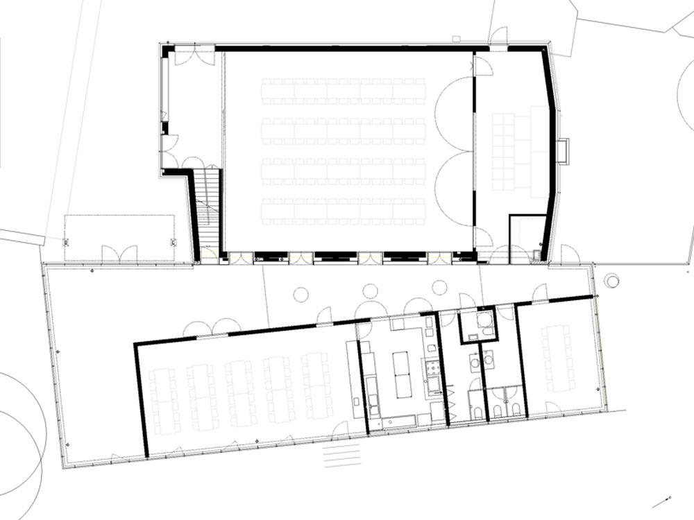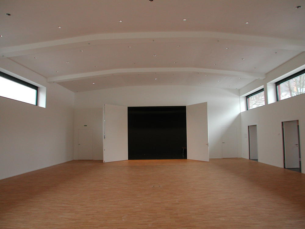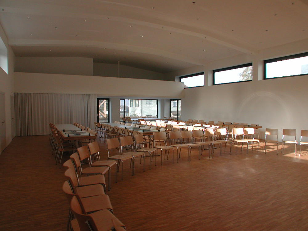 kurzdaten Bauherrschaft Kath. Kirchgemeinde Kirchdorf · 2003 · Umbau der alten Kirche von 1949 in einen Veranstaltungssaal, Neubau mit Foyer, Pfarreistube, Sitzungszimmer, Küche, Umgebungsgestaltung · Kosten 2.5 Mio Franken